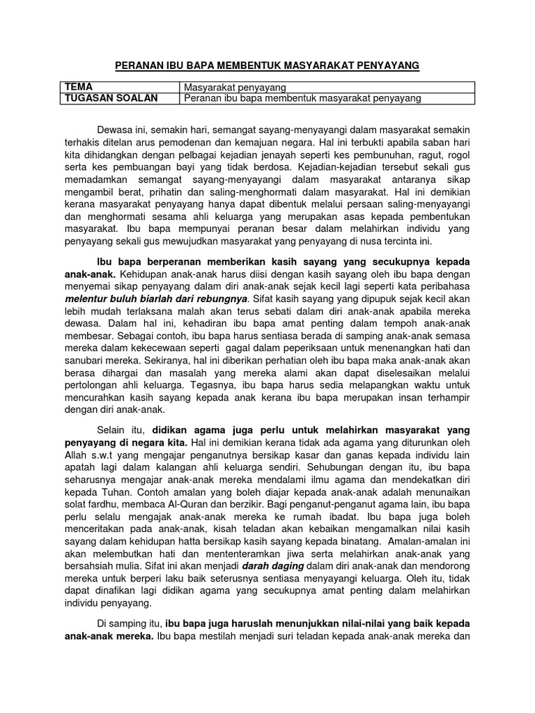 Mereka tidak sedar bahawa sifat atau nilai ini amat penting dalam sesebuah masyarakat walaupun berbeza kaum agama budaya dan adat. KARANGAN PERANAN IBU BAPA MEMBENTUK MASYARAKAT PENYAYANG PERANAN IBU BAPA MEMBENTUK MASYARAKAT PENYAYANG Dewasa ini semakin hari semangat sayang menyayangi dalam masyarakat semakin terhakis ditelan arus pemodenan Negara.